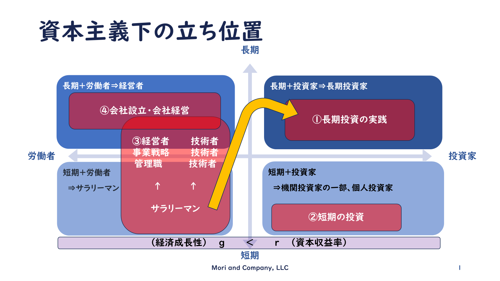 森:一枚絵を紹介させていただきます。資本主義では、人の役割は横軸に労働者と投資家、縦軸に短期的、長期的考え方として分類できます。ピケティのような考え方ですね。ピケティはこの200年で、投資家が労働者に対して、所得の伸び率が圧倒的に良かったとの研究結果を出しました。